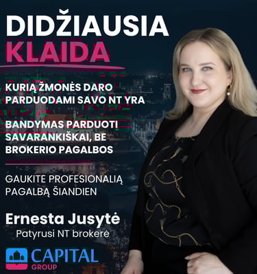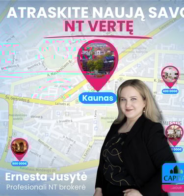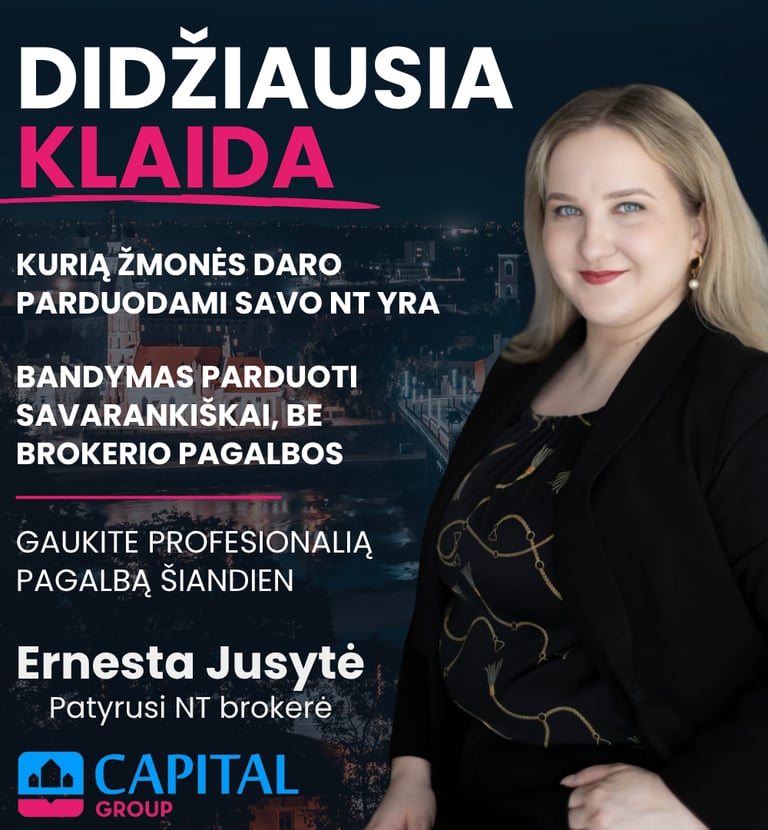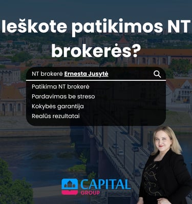 Susipažinkime - esu Ernesta, nekilnojamo turto brokerė. Atstovauju įmonę Capital Group. Turiu daugiau nei 7 metus patirties profesionaliai konsultuojant klientus, vedant mokymus, tad draugiškas kontaktas su žmonėmis yra mano kasdienybė ir vienas malonumas. Be to, 6 metai universitetinio išsilavinimo suteikė daug teorinių bei praktinių žinių finansų, ekonomikos ir bendradarbiavimo srityse. Tačiau ne viskas tik apie žinias. Sąžiningumas, pasitikėjimas ir atvirumas yra tos vertybės, kuriomis kiekvieną dieną vadovaujuosi tiek gyvenime, tiek darbe. Taigi, sujungus reikalingas žinias ir tinkamas vertybes galiu Jums pasiūlyti sąžiningą bei atvirą bendradarbiavimą profesionaliai parduodant, perkant ar nuomojant Jūsų nekilnojamąjį turtą. Aš visada rasiu laiko Jums ir Jūsų rekomenduotiems žmonėms!